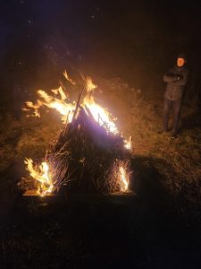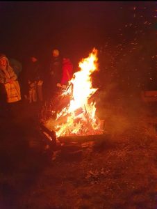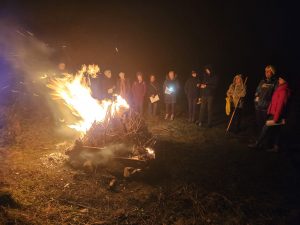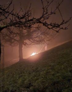 Vom nebeligen Wetter nicht abhalten ließen sich 18 Mitglieder des Turnvereins, um den Zeitpunkt zu feiern, ab dem die Tage wieder länger werden. Die Hoffnung auf neues Leben, mehr Licht, beginnendes Wachstum und Übergang in den kommenden Frühling wird durch den Lichterschein des Feuers in der längsten Nacht des Jahres begrüßt.